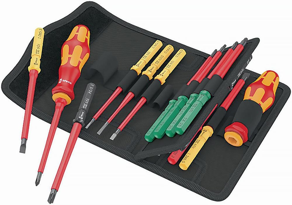 aufgelaserte Größenangabe · mit reduziertem Klingendurchmesser, um auch tiefliegende Schraub- und Federelemente erreichen zu können · Stückprüfung im Wasserbad bei 10.000 V für sicheres Arbeiten bei einer zugelassenen Spannung von 1000 V · textile Tasche mit Flauschzone auf der Rückseite · dank selbsthaftendem Klebestreifens kann die Tasche an die Wera 2go Komponenten geklettet werden