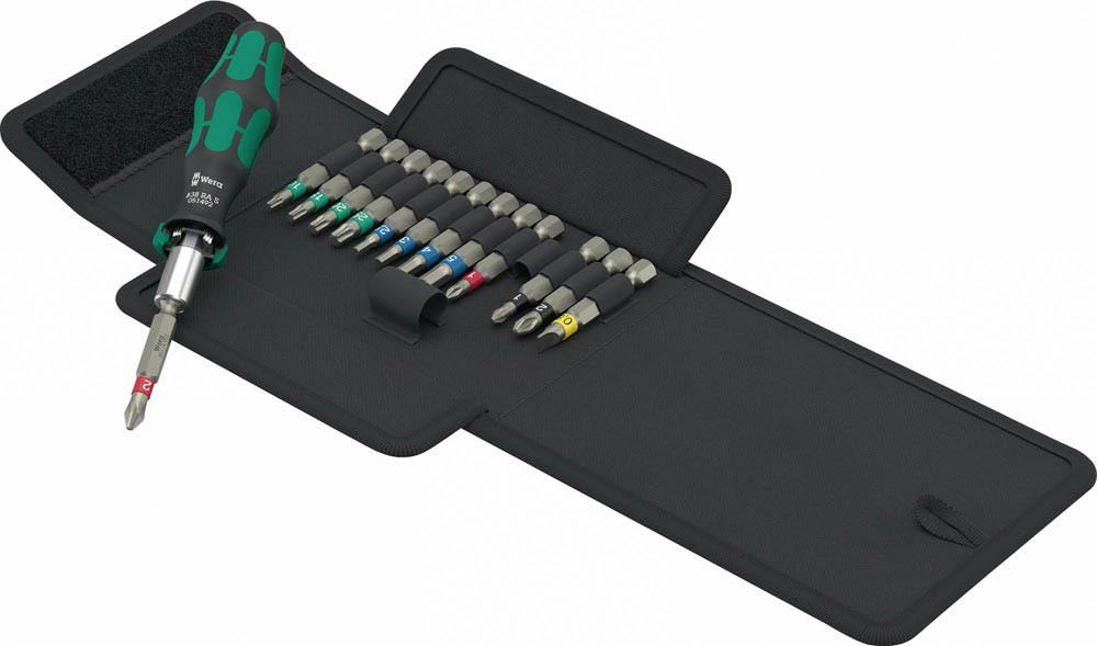 14-teilig · Bits-Handhalter mit intuitiv bedienbarer Ratschenfunktion · vollständig im Griff eingebettete Knarrenmechanik sorgt für sehr handliches und müheloses Arbeiten · ergonomisches Umschalten auf Rechts-/Links- oder 0-Position · Kraftform Plus Griff · magnetischer Bithalter für Bits mit 1/4 ʺ Außensechskantantrieb · Bits chemisch-vernickelt