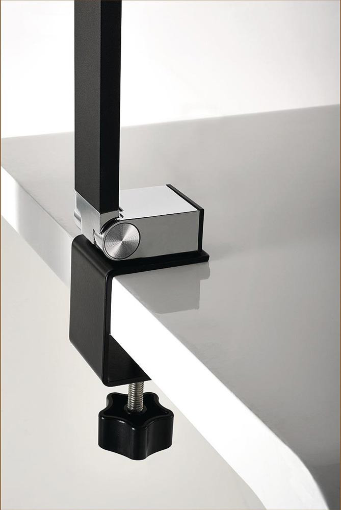 ∙ LED Klemmleuchte, individuell verstellbar ∙ Höhe 480-720 mm ∙ Stufenlose Einstellung der Lichtstärke ∙ 800 mm langer Reflektor für eine großzügige Ausleuchtung der Arbeitsfläche ∙ Am Leuchtenkopf befinden sich verschiedene Symbole, die mittels Touchfunktion bedient werden können · Leuchtfarbe wählbar
