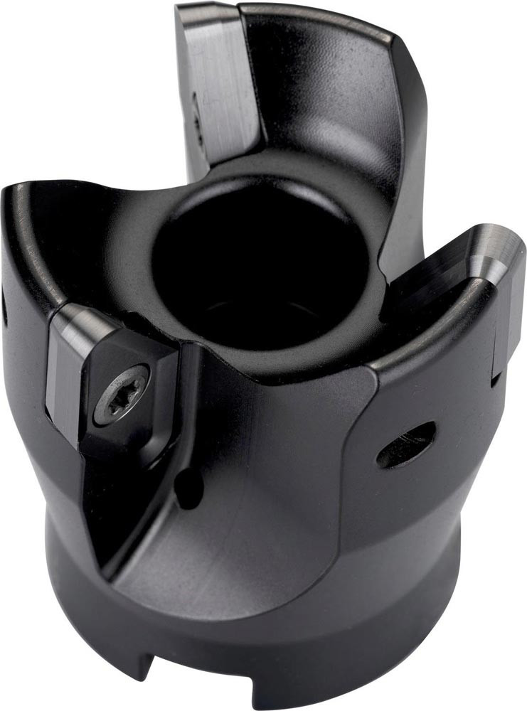Schaftfräser mit doppelt positive Geometrie zum spannen von 4 Stück VCGT 220530F-FA einseitigen Wendeschneidplatten · Schnittdurchmesser 63mm mit 90° Anstellwinkel und 22mm Verbindungsbohrung gemäß DIN 8030-A · 56mm Überstandslänge · Kühlkanalbohrung zum Helikalen Fräsen und progressiven Eintauchen mit einer maximalen Schnitttiefe von 3.0 (16.0)mm