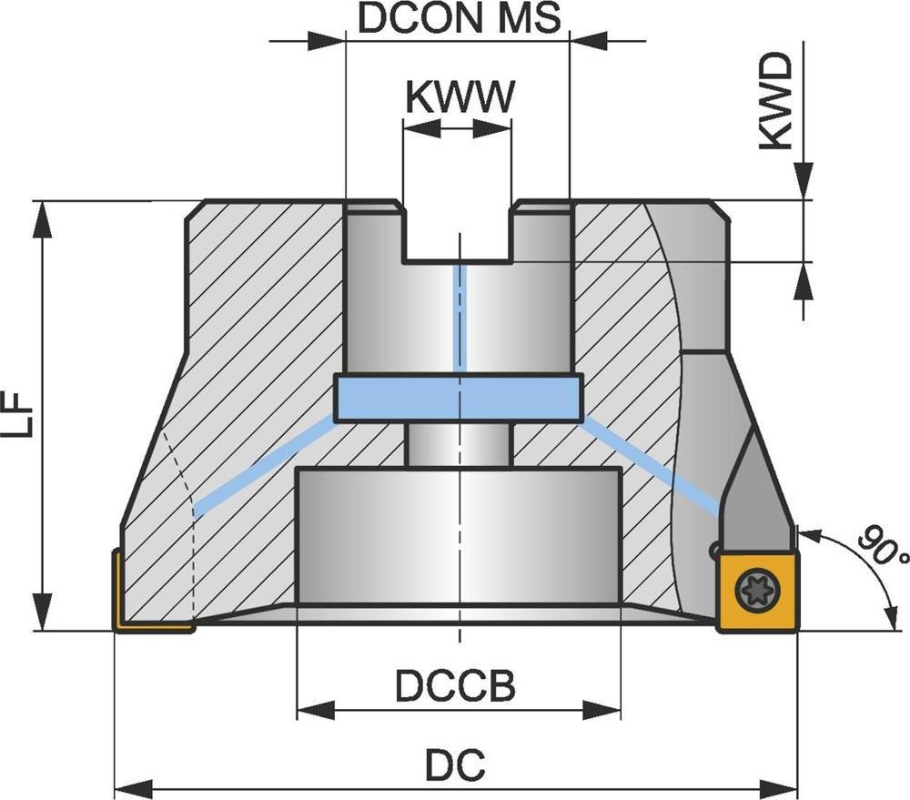 Eckfräser mit positiver/negativer Geometrie zum spannen von 9 Stück SOMT 09T3.. einseitigen Wendeschneidplatten · Schnittdurchmesser 80mm mit 90° Anstellwinkel und 27mm Verbindungsbohrung gemäß DIN 8030-A · 50mm Überstandslänge · Kühlkanalbohrung zum flachen Schulterfräsen · flachen Nutfräsen und Tauchfräsen mit einer maximalen Schnitttiefe von 8.0mm