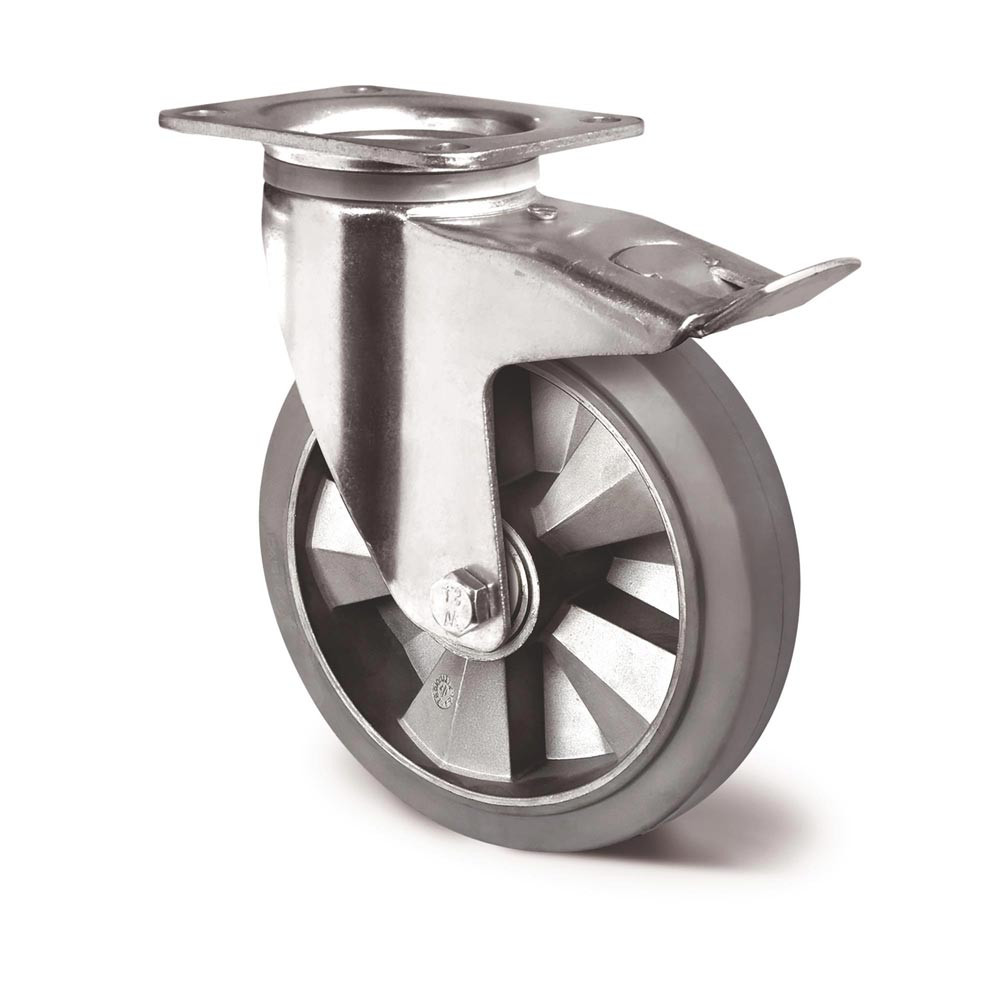 mit Totalfeststeller · stabiles Stahlblechgehäuse, verzinkt chromatiert · zweireihiger Kugelkranz im Gabelkopf · Elastik-Vollgummireifen (grau, fest aufvulkanisiert) auf Aluminium-Radkörper · Radachse verschraubt · Kugellager · mit Plattenbefestigung