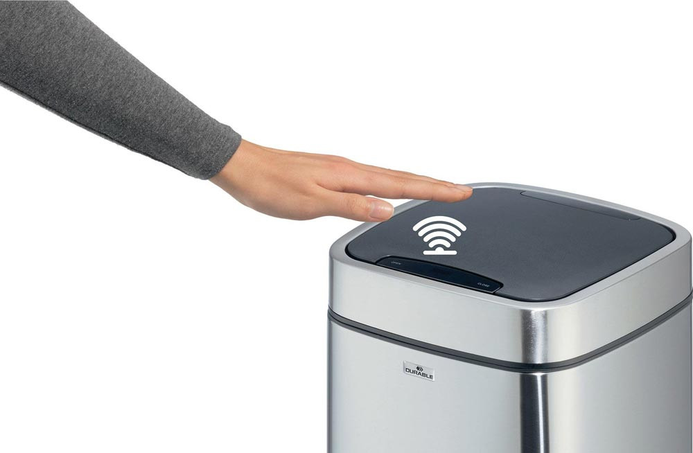 mit Sensor · ermöglichen die kontaktlose Abfallentsorgung in geschlossene Behälter, die besonders unter strengen Hygienerichtlinien erforderlich sind · berührungslose Bedienung durch Sensor-Technik · öffnet durch Bewegungssensor und schließt automatisch, alternativ auch manuell über Open/Close Tasten bedienbar · herausnehmbarer Inneneimer mit Henkel und Beutelfixierung · abnehmbarer Deckel zum einfachen Entleeren · Soft-Close Funktion des Deckels · Korpus aus Edelstahl mit Fingerprint-Proof Beschichtung · rutschfester Sockel und viereckige Form zum platzsparenden Platzieren · benötigt 4 AA Batterien (nicht im Lieferumfang enthalten)