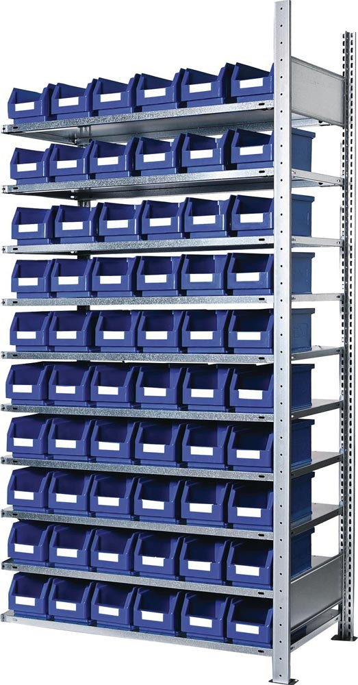 komplett mit Sichtlagerkästen Raster-Plan°· einfache und schnelle Steckmontage mit vormontierten verzinkten Rahmen · Fachböden verzinkt mit verstärktem Kastenprofil, H 25 mm, höhenverstellbar im 25-mm-Raster · Tragfähigkeit pro Fachboden 150 kg · Feldlast 1300 kg