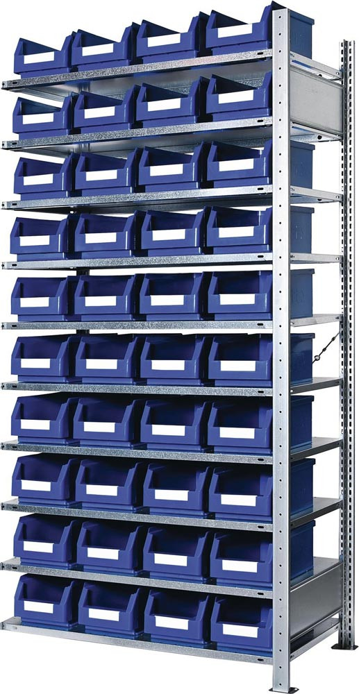 komplett mit Sichtlagerkästen Raster-Plan°· einfache und schnelle Steckmontage mit vormontierten verzinkten Rahmen · Fachböden verzinkt mit verstärktem Kastenprofil, H 25 mm, höhenverstellbar im 25-mm-Raster · Tragfähigkeit pro Fachboden 150 kg · Feldlast 1300 kg