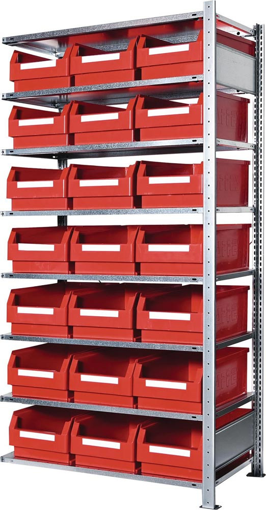 komplett mit Sichtlagerkästen Raster-Plan°· einfache und schnelle Steckmontage mit vormontierten verzinkten Rahmen · Fachböden verzinkt mit verstärktem Kastenprofil, H 25 mm, höhenverstellbar im 25-mm-Raster · Tragfähigkeit pro Fachboden 150 kg · Feldlast 1300 kg