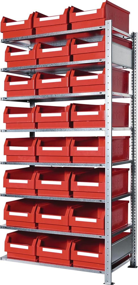 komplett mit Sichtlagerkästen Raster-Plan°· einfache und schnelle Steckmontage mit vormontierten verzinkten Rahmen · Fachböden verzinkt mit verstärktem Kastenprofil, H 25 mm, höhenverstellbar im 25-mm-Raster · Tragfähigkeit pro Fachboden 150 kg · Feldlast 1300 kg