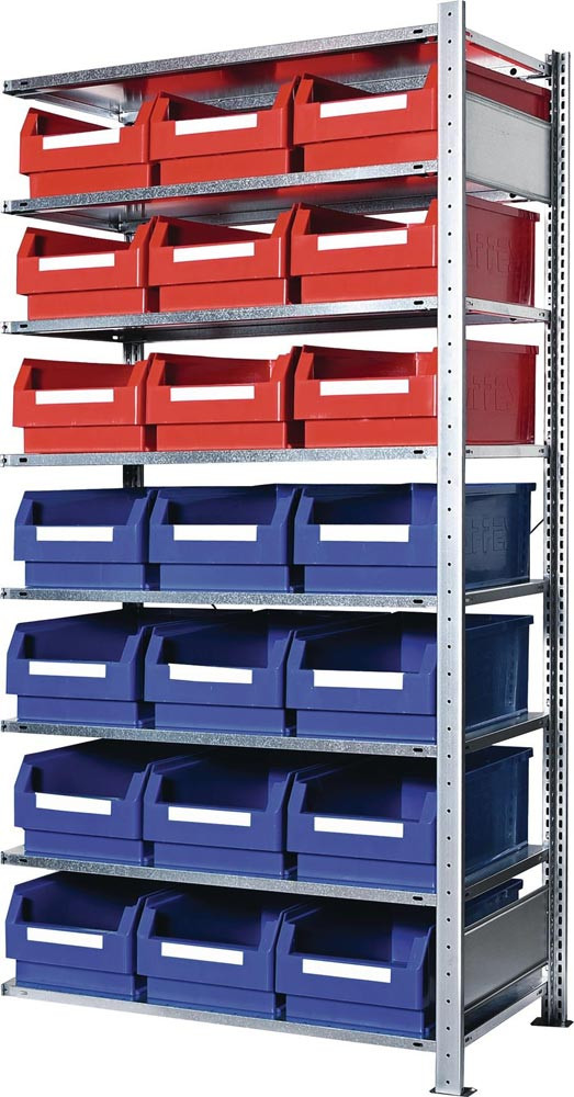 Steckregal H2000xB1000xT500mm Anbauregal 8 Stahlböden 9 x Gr. 2 blau, 12 x Gr. 2 rot