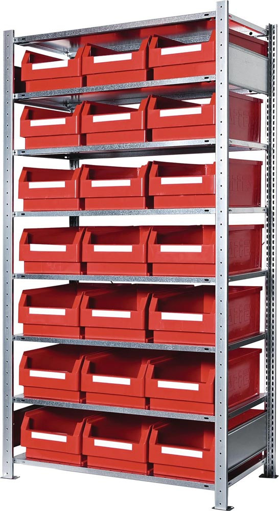 komplett mit Sichtlagerkästen Raster-Plan°· einfache und schnelle Steckmontage mit vormontierten verzinkten Rahmen · Fachböden verzinkt mit verstärktem Kastenprofil, H 25 mm, höhenverstellbar im 25-mm-Raster · Tragfähigkeit pro Fachboden 150 kg · Feldlast 1300 kg