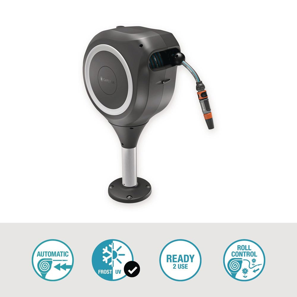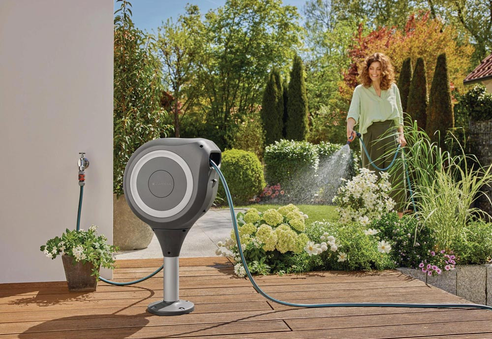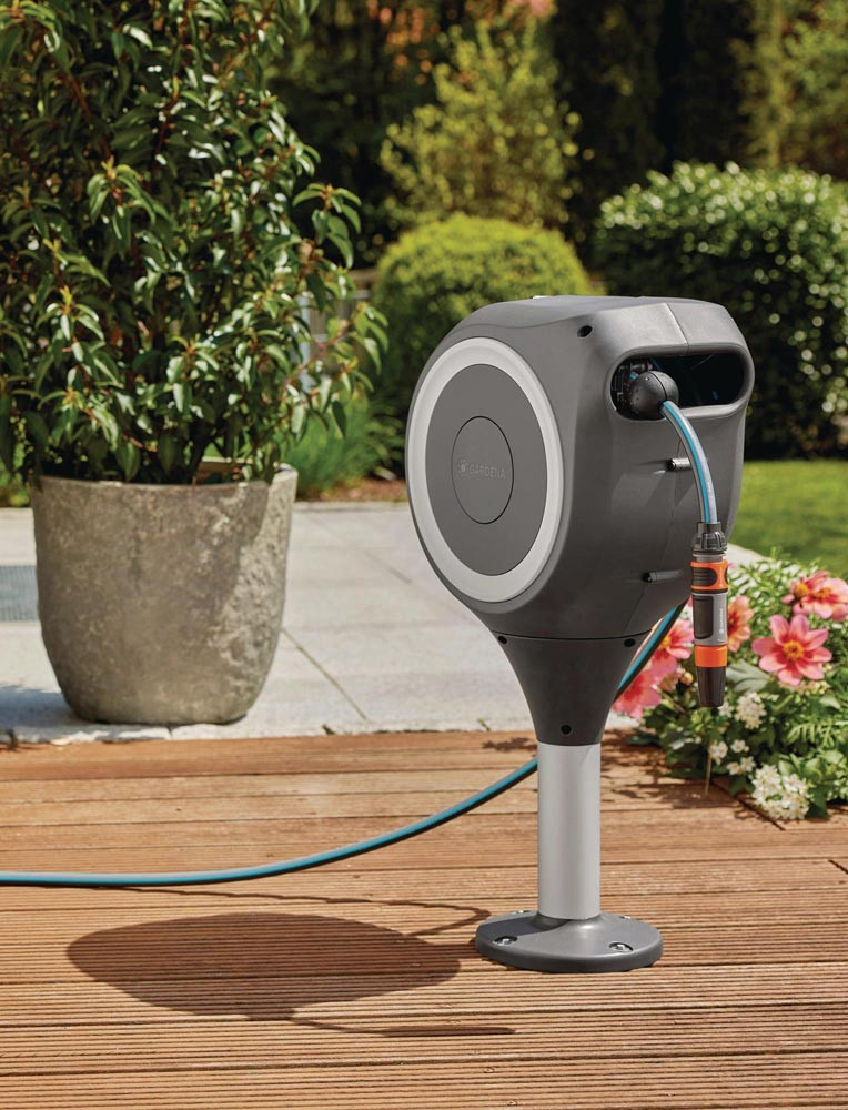 RollUp-Technologie (Stahlantriebsfeder) sorgt für ein einfaches Ausrollen und bequemes Aufrollen ohne Verwicklungen · wetterfest: mit UV- und Frostschutz · zur Montage direkt auf Holz- oder Betonböden - um 360° drehbar, ohne dass der Schlauch dabei geknickt wird · Installation direkt auf der Terrasse - für kleinere Gärten und mit Aufrollfunktion