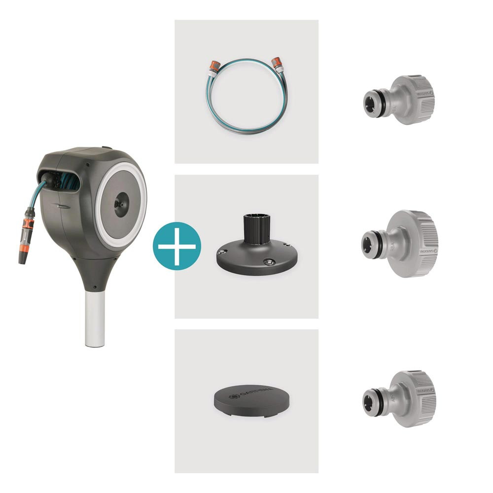 Lieferumfang: GARDENA Terrassen-Schlauchbox RollUp, inkl. GARDENA Qualitätsschlauch 11 mm, flexibler Anschlussschlauch 1,5 m, Original GARDENA Systemteile (Hahnverbinder, Schlauchverbinder, Wasserstop), Reinigungsspritze, Universalbefestigung inkl. Schrauben und Dübel