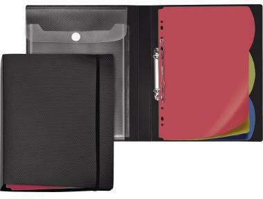 Mit 3-teiligem Register aus Polypropylen-Folie. Auf der linken Innenseite befindet sich eine Tasche mit Klettverschluss.