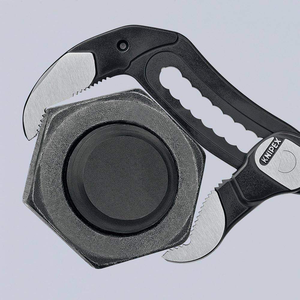 Länge: 9-stufige Rastenverstellung für 30 % mehr Greifkapazität · selbstklemmend an Rohren und Muttern · Klemmschutz · Greifflächen mit spezialgehärteten Zähnen · Härte der Zähne ca. 61 HRC · Klemmschutz · Chrom-Vanadin-Elektrostahl, geschmiedet, mehrstufig ölgehärtet