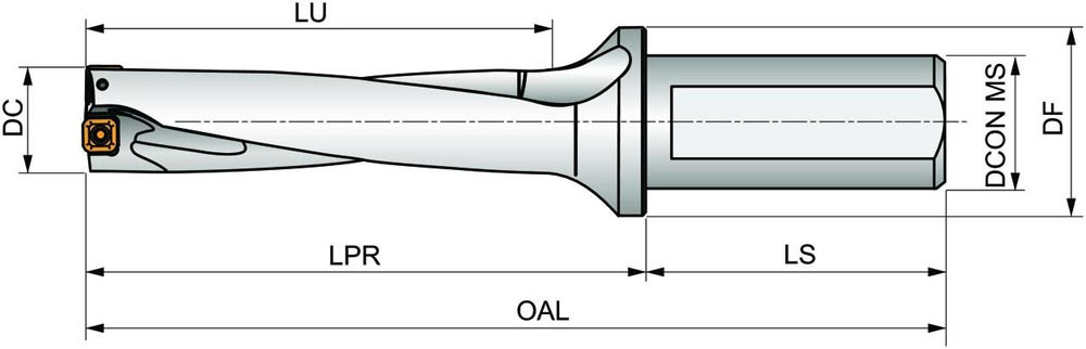 Wendeschneidplattenbohrer zum einsetzen von einer XPET 1904.. Wendeschneidplatten als Zentrumschneide und einer SCET 1505.. Wendeschneidplatte als Außenschneide · Bohrdurchmesser 53mm · mit einem 40mm abgeflachten Zylinderschaft nach ISO 9766 und Innenkühlung für maximale Bohrtiefen bis 4 x D