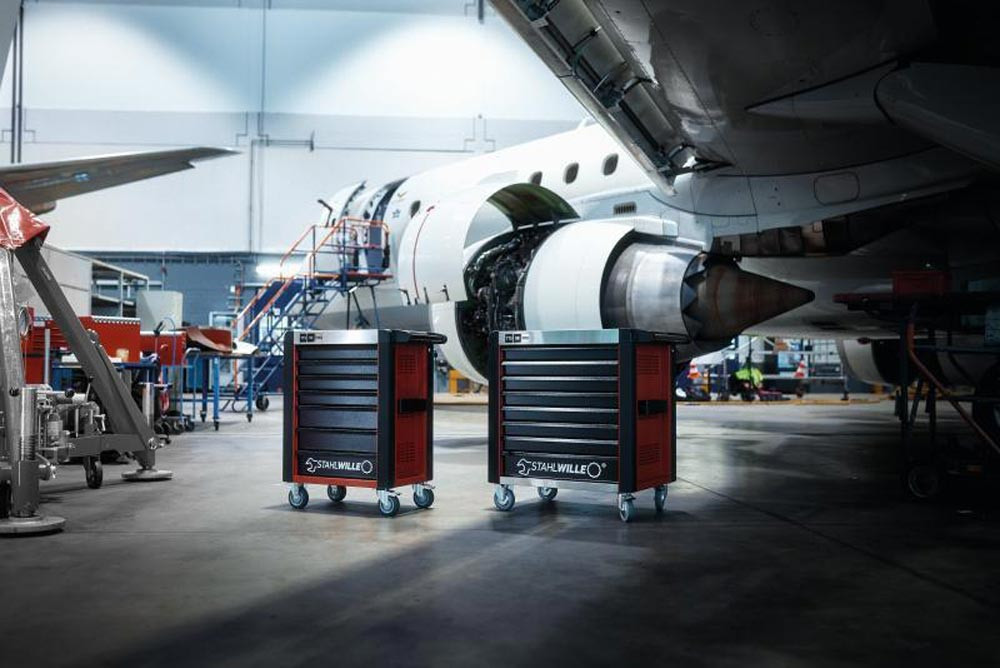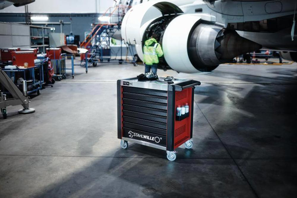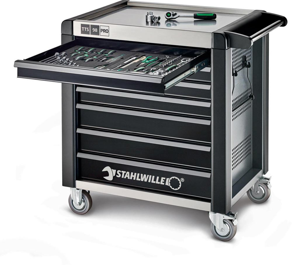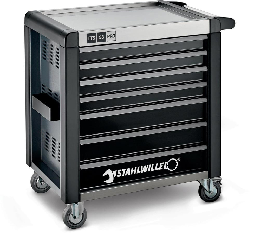 3-stufiges Sicherheitskonzept: Zentralverriegelung durch seitliches Zylinderschloss mit abklappbarem Schlüssel · Einzelverriegelung verhindert unbeabsichtigtes Öffnen während der Fahrt · Kippschutz gleichzeitiges Herausziehen mehrerer Schubladen nicht möglich · 100 % vergrößertes Schubladenvolumen im Vergleich zu 93 und TTS 95 PRO · Stahlgriff mit verstärkter Korpusanbindung · umlaufender Rammschutz mit Aufpralldämpfung · dicht verschweißte widerstandsfähige Arbeits- und Ablagefläche sowie Abschlussblende aus Edelstahl · öl- und säurebeständige, kugelgeführte Leichtlaufräder (Ø 125 mm) mit Fadenschutz zum Schutz der Lager vor Schmutz und Fäden, mit zwei Feststellbremsen · Papierrollen- und Spraydosenhalterung inklusive · 7 leicht herausnehmbare Schubladen (schwarz RAL 9005) mit Vollauszug und Kugelkäfigführung · beidseitige Lochraster · pulverbeschichtet