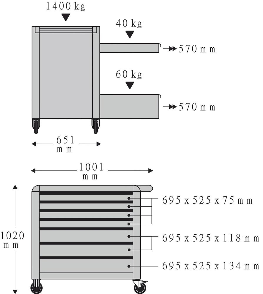 Schubladeninnenmaße B x T x H 525 x 695 x 75 mm (4x) 525 x 695 x 118 mm (2x) 525 x 695 x 134 mm (1x) mm