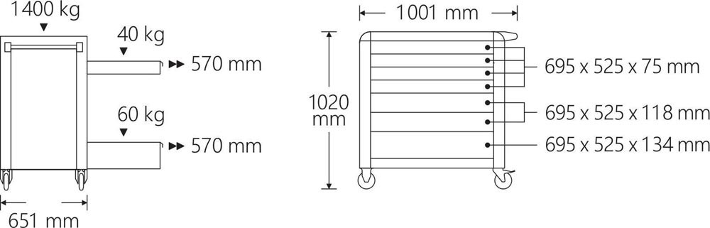 · Schubladen-Innenmaße mm: 525 x 695 x 75 mm (4x), 525 x 695 x 118 mm (2x), 525 x 695 x 134 mm (1x)