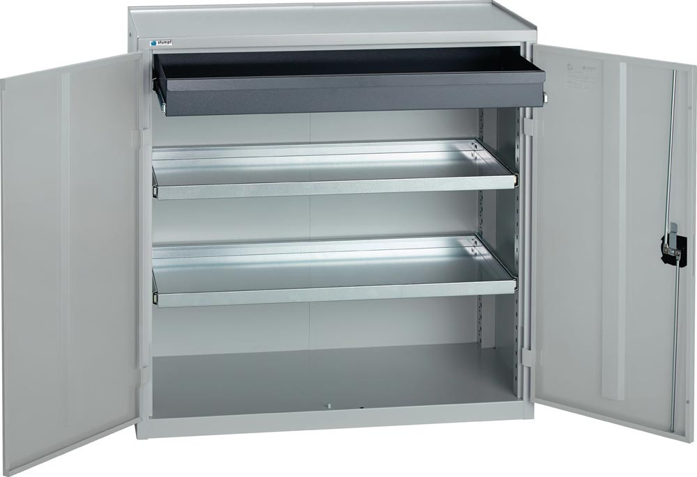 Stahlblechkonstruktion mit widerstandsfähiger Pulverbeschichtung · ausgestattet mit Schubladen und herausziehbaren Fachböden, mit allseitigem Rand, Höhe 30 mm, auf kugelgelagerten Präzisionsauszügen, 100 % ausziehbar · Schubladen, H 100 mm und Fachböden im 25-mm-Raster höhenverstellbar · Tragfähigkeit pro Fachboden/Schublade 35 kg · obere Ablage mit Abrollrand · Flügeltür abschließbar mit Zylinderschloss und Drehriegelverschluss mit 3-Punkt-Verriegelung