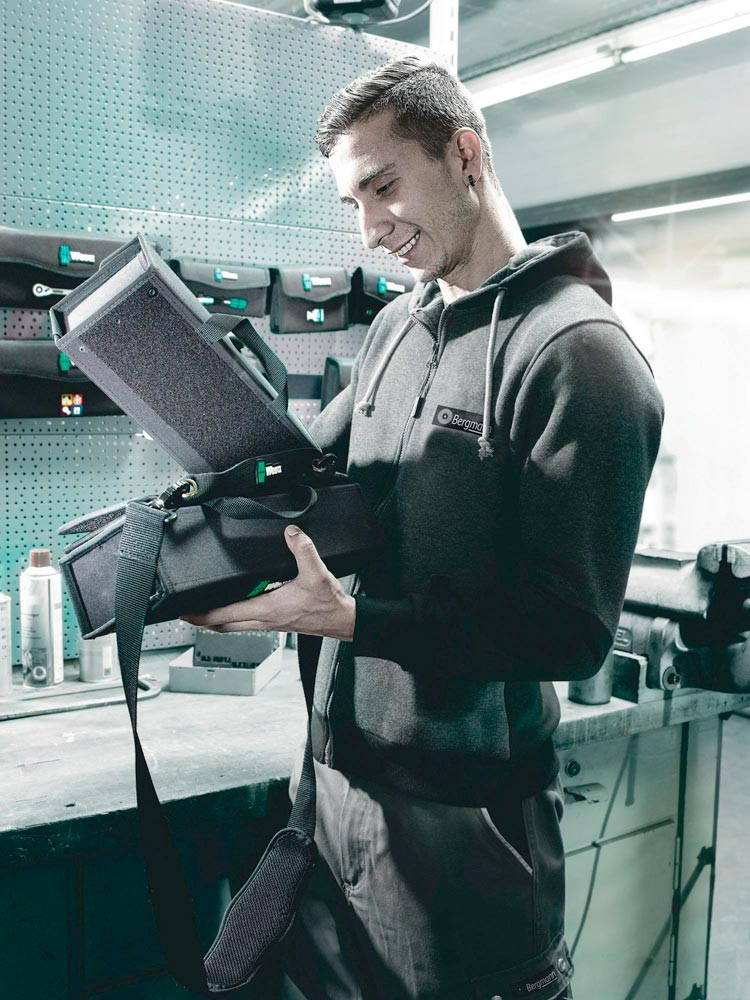 superleicht und mobil, ideal für alle Wera Taschen und textilen Boxen mit rückseitigem Klett · Taschen und Boxen individuell einfach und sicher an den Werkzeugträger kletten · alle Händen bleiben beim Transport dank des Tragegurts frei