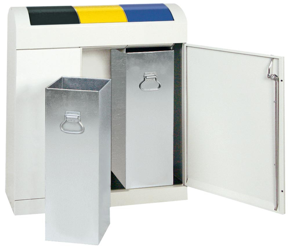Werstoffsammelstation, 3x45 Liter, BxTxH 860x320x975 mm, Korpus RAL 7035 lichtgrau, Schwingdeckel blau+gelb+anthrazit EP511176