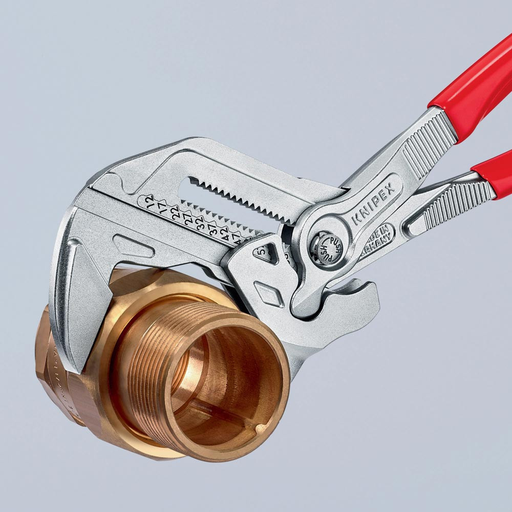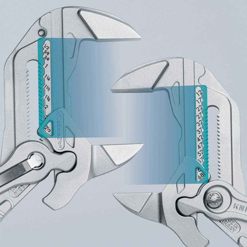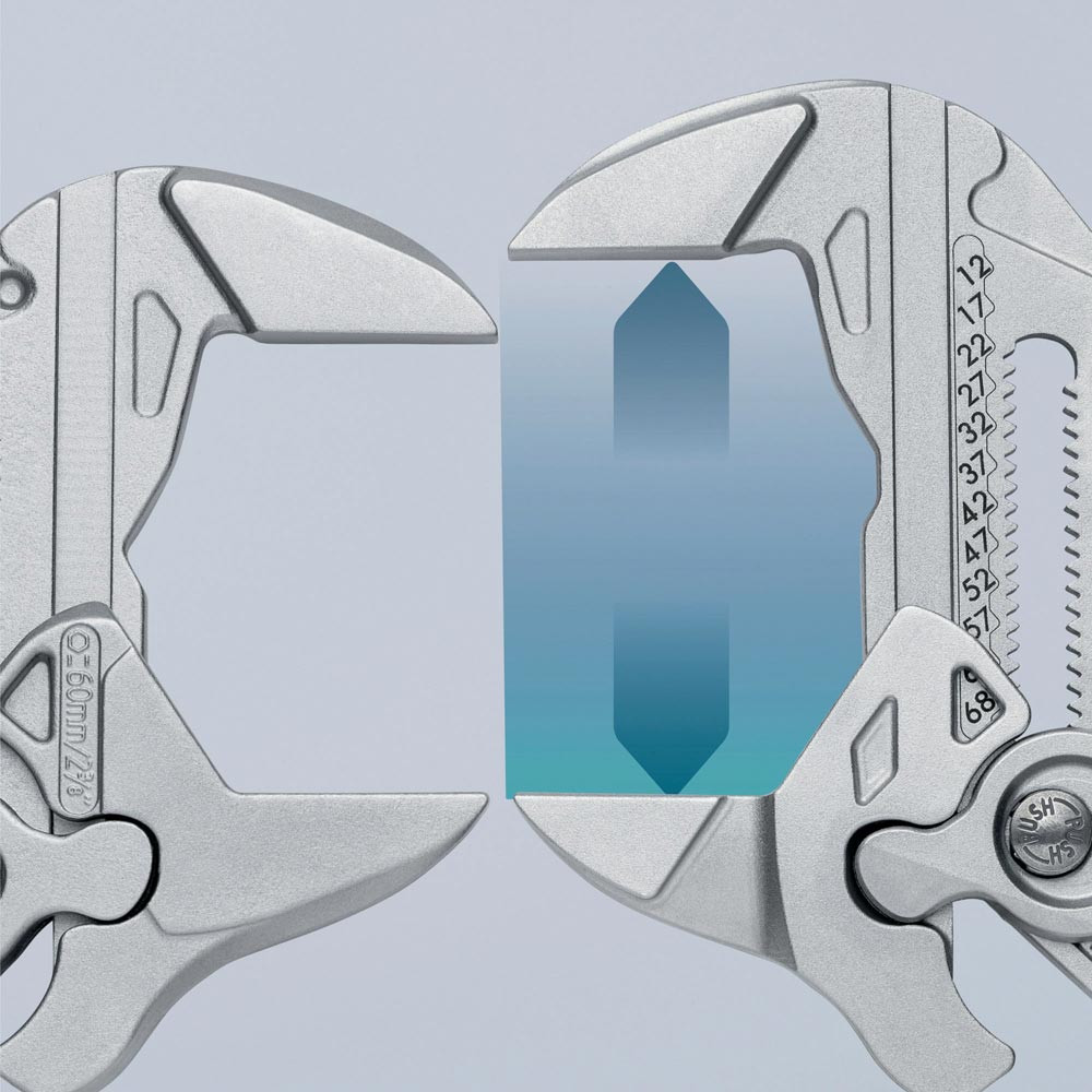 ersetzt einen Satz Schraubenschlüssel, metrisch wie zöllig · glatte Backen für die schonende Montage von oberflächenveredelten Armaturen · Arbeiten direkt auf Chrom · Schnellverstellung per Knopfdruck · Chrom-Vanadin-Elektrostahl, geschmiedet, ölgehärtet
