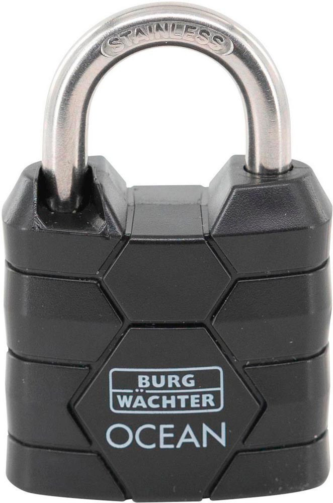 massiver Messingkörper · stoß- und kratzfester Kunststoffmantel · Bügel doppelt verriegelt · Edelstahl rostfrei · seewasserfest